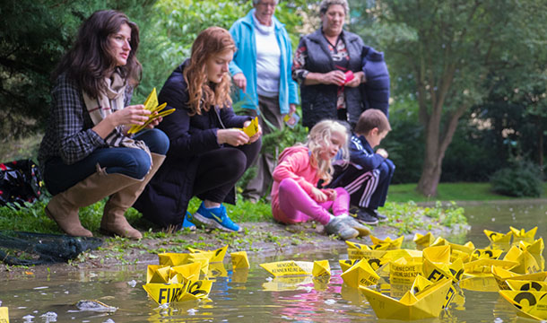 September 2014: SOS-Europa - die Jugendgruppe von Amnesty Bad Honnef macht am Reitersdorfer Weiher in Bad Honnef mit hunderten von Papierbötchen auf das verzweifelte Schicksal von Flüchtlingen vor den Toren Europas aufmerksam. Foto: Frank Homann