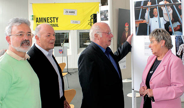 Angel Just und Wilfried Schneider führen Dr. Norbert Blüm (Bundesmininster a. D) und Bürgermeisterin Wally Feiden zum 25. Gruppenjubiläum im Juni 2012 durch eine Amnesty-Ausstellung im Rathaus Bad Honnef. Thema: Flüchtlinge in Mexiko. Foto: Rudolf Weichsel