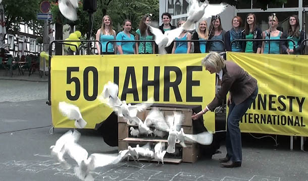 Die Stellv. Bürgermeisterin Annette Stegger lässt anlässlich des 50jährigen Geburtstags von Amnesty International im Mai 2011 fünfzig Tauben auf dem Marktplatz frei. Im Hintergrund der Jugendgospelchor der ev. Gemeinde.