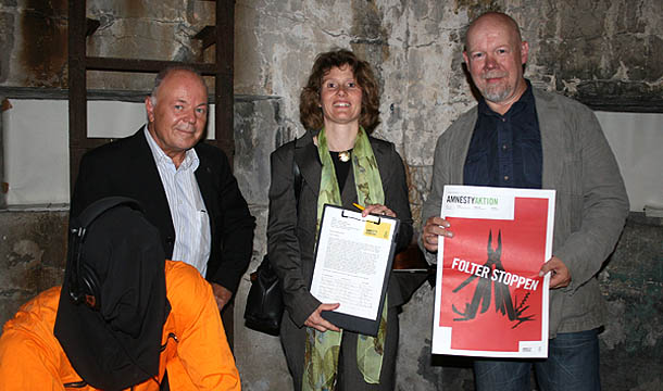 Anti-Folter-Ausstellung im Brückenturm zu Erpel, September 2011. Die Stellv. Ministerpräsidentin des Landes Rheinland Pfalz Eveline Lemke mit Amnesty-Mitglied Wilfried Schneider (l.) und Künstler Helmut Reinelt (r.).