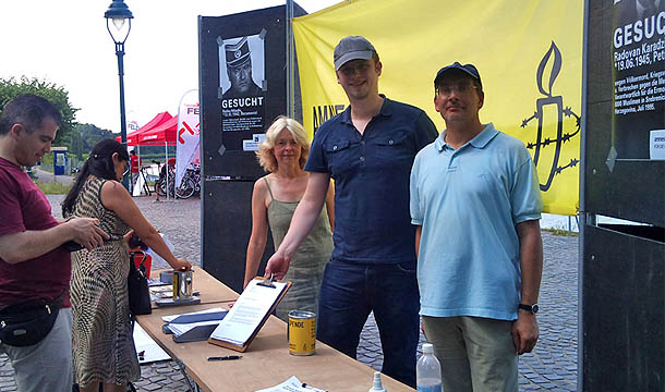 Aktion der Bad Honnefer Gruppe mit dem Bonner Amnesty-Bezirk zum 16. Jahrestag des Massakers von Srebrenica, Juli 2011.