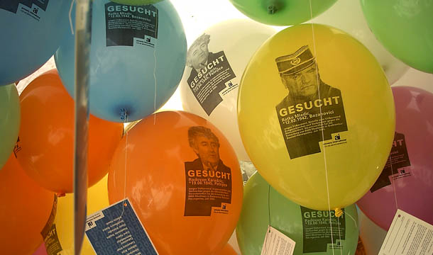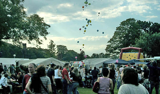 Luftballon-Aktion beim Rockkonzert "Rheinspaziert" auf der Insel Grafenwerth anlässlich des 10. Jahrestages des Massakers von Srebrenica, Juli 2005.