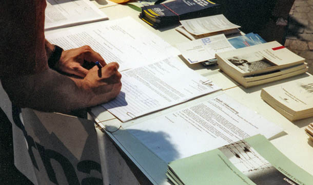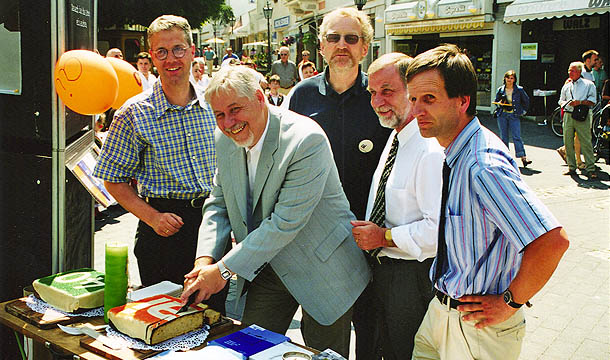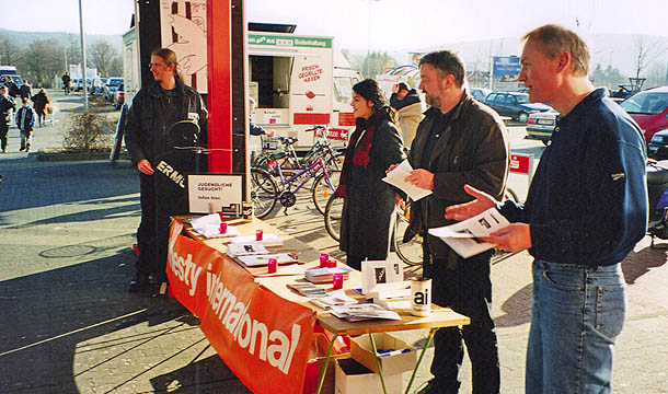 Unterschriften-Sammlung und Info-Stand zur Neugründung der Jugendgruppe am HIT-Markt in Bad Honnef, Januar 2000.