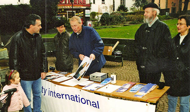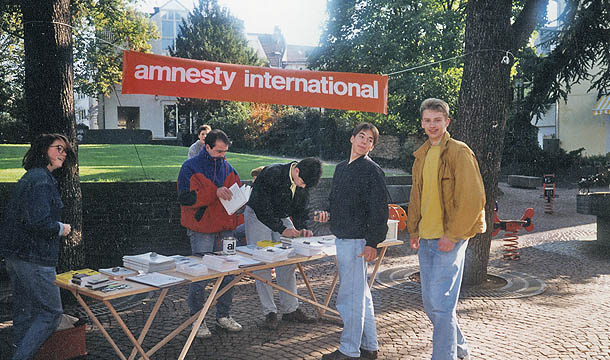 Die neugegründete Jugendgruppe bei einem ihrer ersten Infostände in der Bad Honnefer Fußgängerzone, September 1991. Thema: die schweren Menschenrechtsverletzungen in China vom Juni 1991.
