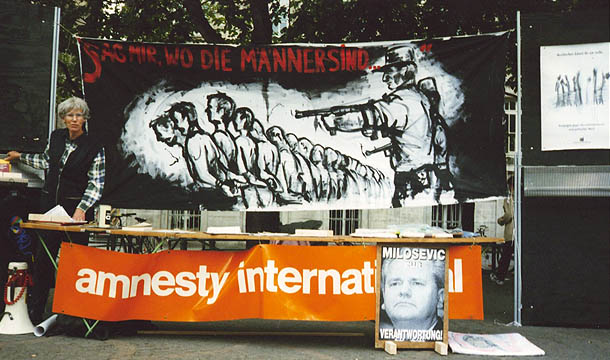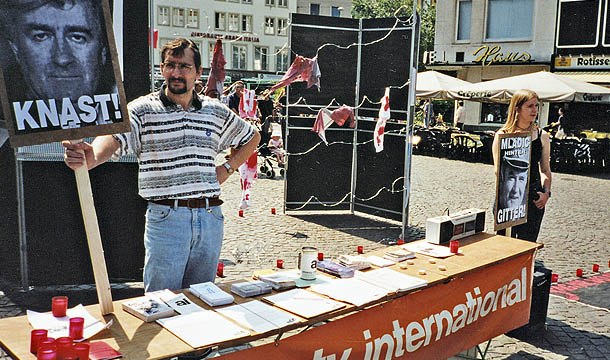 Aktion der Amnesty-Gruppe Bad Honnef zusammen mit dem Bonner Amnesty-Bezirk in der Bonner Innenstadt anlässlich des 4. Jahrestages des Massakers von Srebrenica, Juli 1999.
