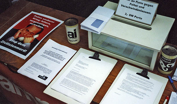 Appellaktion in der Bad Honnefer Fußgängerzone gegen Menschenrechtsverletzungen durch russische Truppen in Tschetschenien, 1999.
