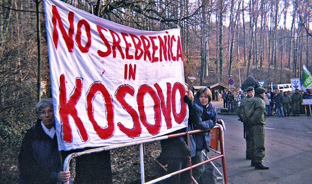 "EU-Responsibility for Kosovo" - Mahnwache zu den Menschenrechtsverletzungen im Kosovo anläßlich des EU-Gipfels am Petersberg bei Königswinter, März 1999.