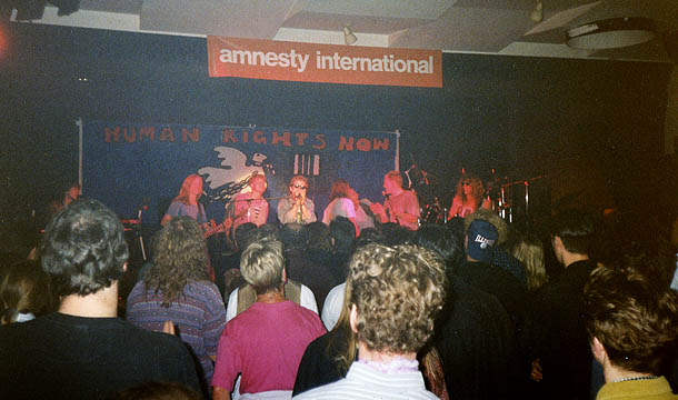 Rockkonzert der Bad Honnefer ai-Gruppe mit Every Little Thing, TassKaff u.a. in der Bad Honnefer Trinkhalle, Mai 1993. Hier ein Transparent von Marc Potocnik.